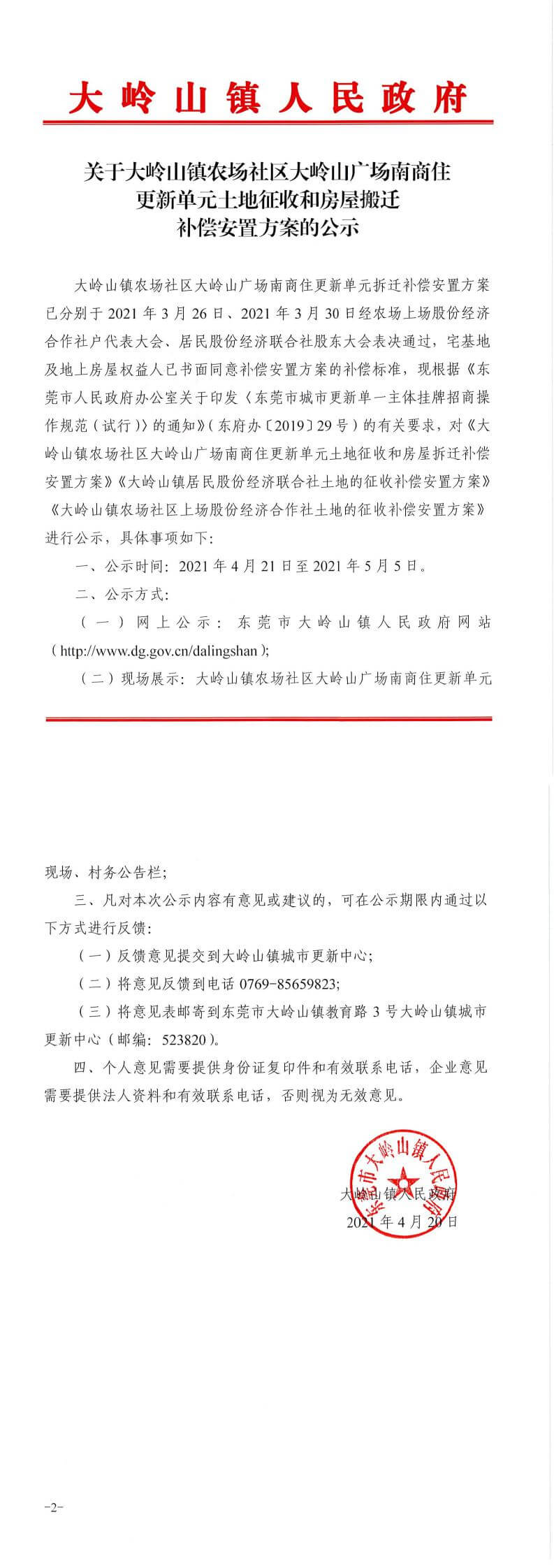 发布于 2021.04.21关于大岭山镇农场社区大岭山广场南商住更新单元土地征收和房屋搬迁补偿安置方案的公示关于大岭山镇农场社区大岭山广场南商住更新单元土地征收和房屋搬迁补偿安置方案的公示附件1.大岭山镇居民股份经济联合社土地的征收补偿安置方案.doc2.大岭山镇农场社区大岭山广场南商住更新单元土地征收和房屋拆迁补偿安置方案.doc3.大岭山镇农场社区上场股份经济合作社土地的征收补偿安置方案.doc其他跳转原文